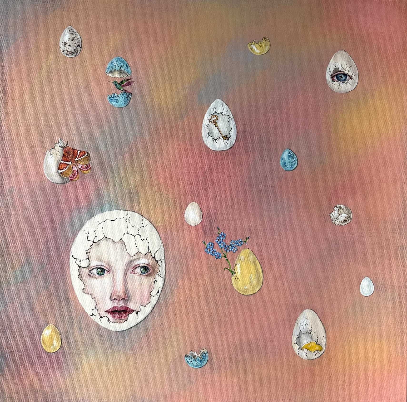 Drawing from her personal experience of rebuilding life in the United States after the war in Ukraine, Shugaieva developed a distinctive visual language rooted in symbolism. The egg appears as a recurring motif—an ancient representation of fragility, potential, and rebirth—alongside other elements that reflect inner psychological states.