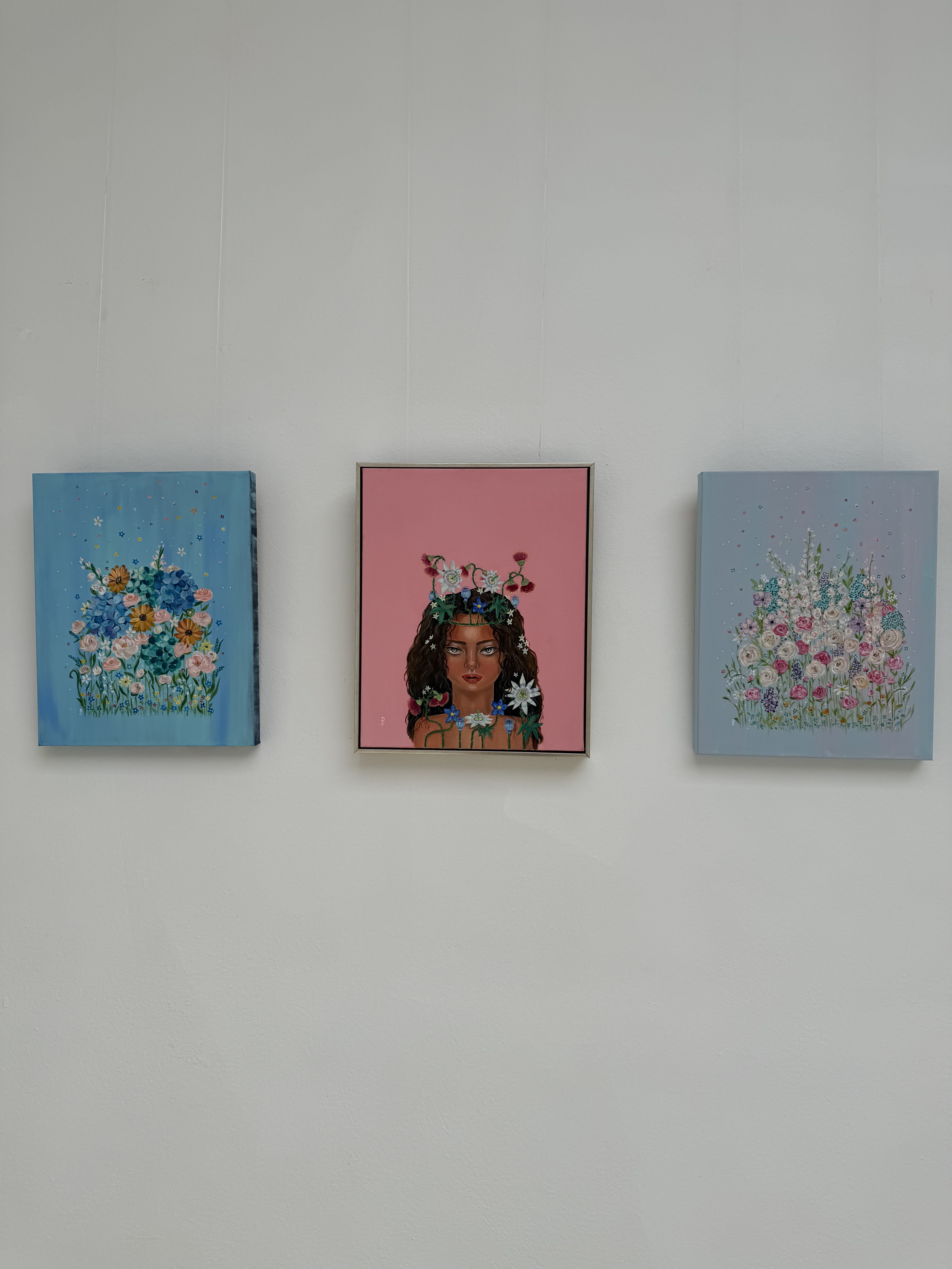 Working in oil and acrylic, she combines ethereal color fields with intricate detail, creating intimate, dreamlike compositions that invite reflection and emotional connection.